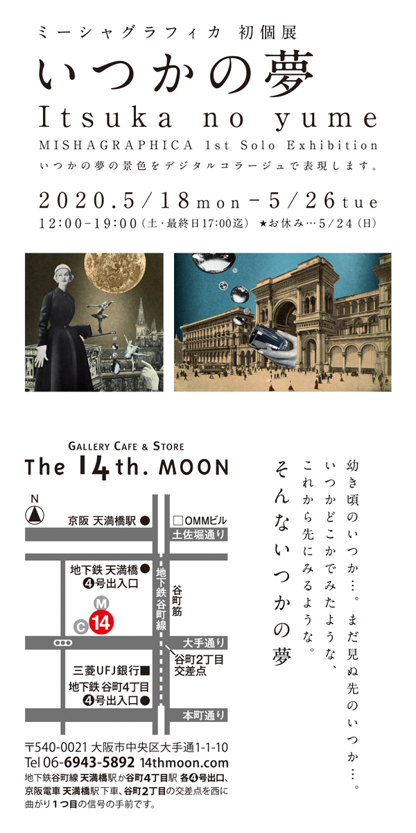 5月に大阪のThe14thmoonさんで、初個展『いつかの夢』を開催します。 新作のコラージュを多数、展示いたします。 今回の展示はミーシャグラフィカの初めての個展でもあり、 新作一つ一つに力をこめています。 ですので、心の中では多くの方に見に来ていただきたい気持ちでいっぱいなのですが、 こんな状況ですので、ご無理のない範囲でお越しいただけたら幸いです。